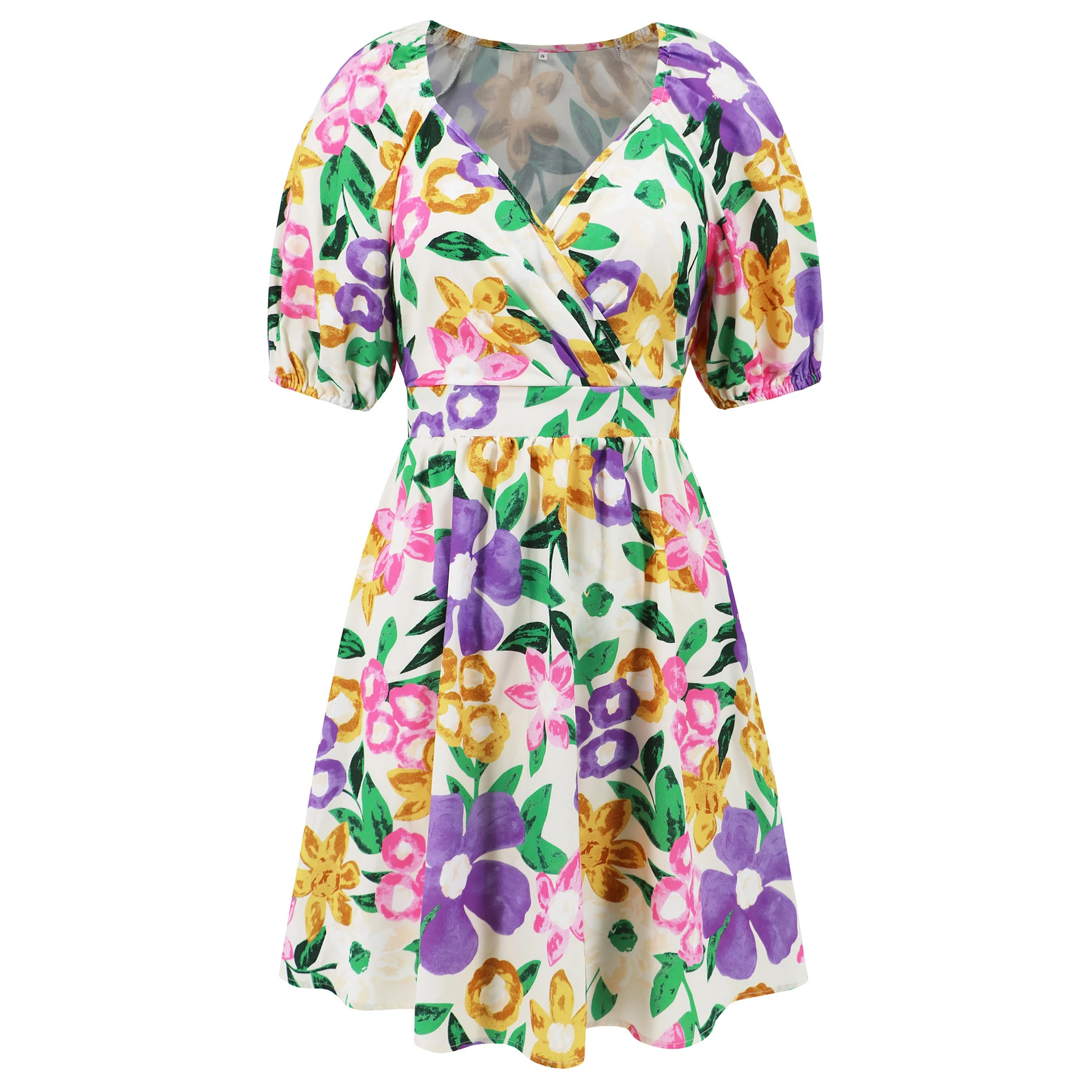 Design: lantern bubble sleeve design, V-neck printing, waist section stretch elastic, short sexy and flirty, suitable for beach vacation.