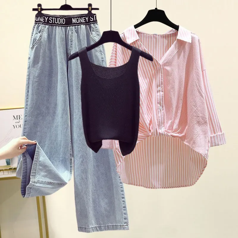 Striped Shirt Small Sling Wide Leg Jeans Three-piece Set